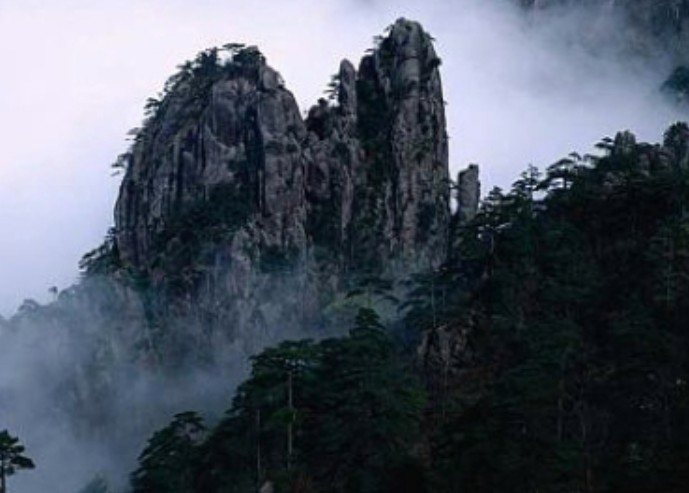 筆架山是一座石山,十分陡峭。山巖猶如刀削,看不見行人的蹤跡。山中只有一條埋藏在密林中的彎曲小徑,可將人引上山去。上了筆架山頂,一眼望去,翠綠的青山,猶如一座座剛從大海里冒出來的潔凈小島,一會兒被驚濤大浪埋進云海,—會兒又被海水輕輕推出海面,露出一點點蒼翠的山頂?;译牧髟骑w霧,終日在筆架山上如浪似濤般地滾動著,翻卷著,那么縹緲、那么幽靜、那么引人遐想!