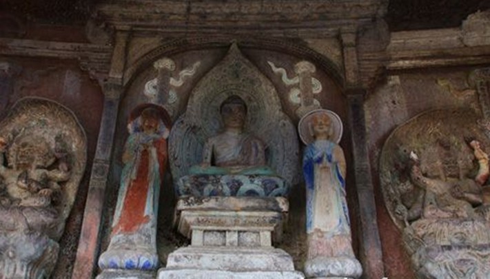 此窟為當地人張氏為造福而刻,屬平民資助,造像簡單技巧拙樸。釋迦佛坐蓮花座,雙盤腳,左手在腹前結定印,右手觸地降魔印,此造型流行于密教。彌勒菩薩在武周時代被武則天運用于政治意義上,武后自稱彌勒下生,偽造《大云經》 ,以宗教為奪權工具,在各地普造彌勒佛像,彌勒一改菩薩造型成為如來身。此窟彌勒佛雙腳立地倚坐,結說法印,和中原的彌勒佛同造型。