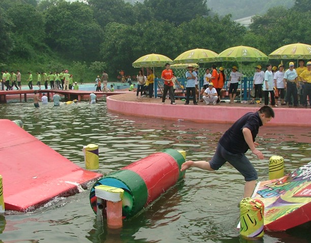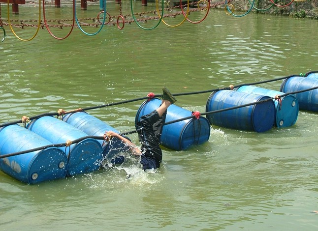 參訓隊員必須從岸邊的起點,利用空中的長繩蕩到水面的兩個1平米的平臺上,一個平臺站滿人后再轉移到另一平臺上,每個平臺目前最多可站26人。訓練各級人員相互理解、互相包容,相互支持與緊密合作,打破隊員之間、男女之間、部門之間的隔閡,勇創佳績的決心和勇氣。