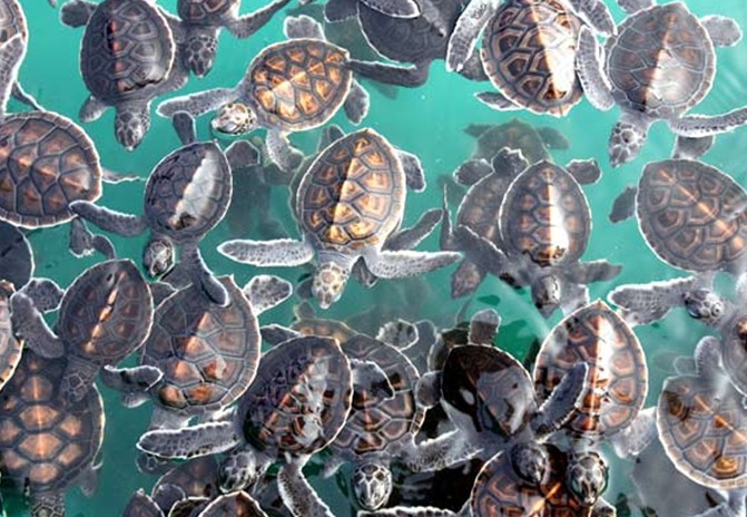 海龜是海洋龜類的總稱,是所有龜鱉類動物中唯一生活在海洋的物種,分布范圍十分廣泛,分布于除北冰洋外的全球海域中。背上有殼,較一般陸龜或河龜來得花紋復雜,殼的外型是扁平流線形。海龜的腳為適應長途游泳,演化成船槳狀。