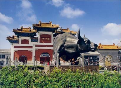 這座金碧輝煌、雕梁畫棟的大殿叫做文元殿,它高22米,造價600多萬。是仿清西陵泰陵的“隆恩殿”建造的,取“隆福齊天,恩澤萬世”之意。文元殿內設有一個舞臺,配有現代化的音響、燈光設備。殿內能容納400人就座(現有200多個座椅)是會務、演出的理想場所。通過扶梯可達到二層,上面展出的是優龍集團的創業史。