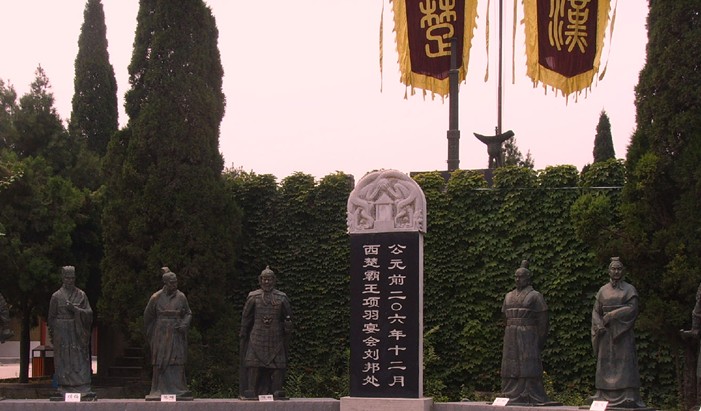 公元207年,項羽從謀士范增之計,在鴻門設宴,企圖借機殺掉劉邦,于是演出了一幕“鴻門宴”,著名的典故“項莊舞劍,意在沛公”就是指這段故事。現存遺址用青磚砌成,十米高的旗桿上飄揚著杏黃色的帥旗,臺子北面建了一座蒙古包似的軍帳,門口高掛“楚高軍旗”,帳內模擬當時的宴會場面,軍帳用玻璃鋼制成,里面塑有“項莊舞劍、樊噲闖帳”等塑像,生動的再現了當年戰事中的重要一幕。