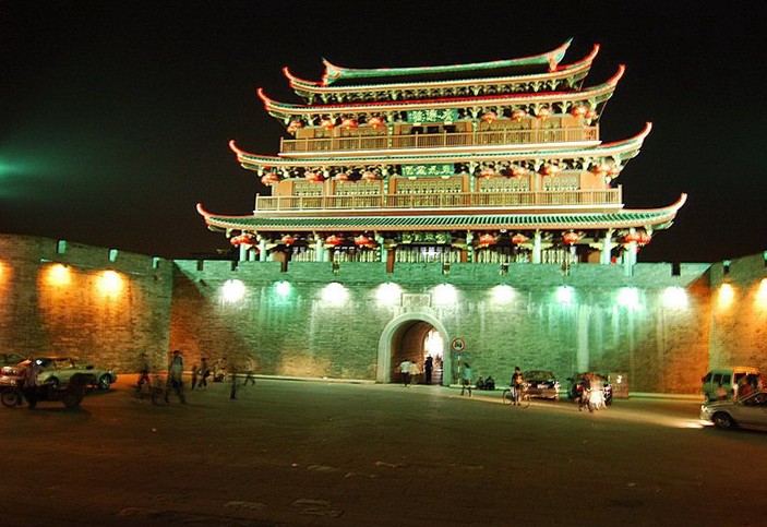 廣濟門城樓是一座宮殿式三層歇山頂閣樓,外城門原有“東為萬春”門額。樓置于高大厚實的臺基上,拱門中開,面闊七間,進深五間,前后面為木石柱相銜接支撐,并跨出城墻外,成為騎樓。城樓為仿宮殿式建筑,重檐歇山頂,配以玻璃瓦紅彤壁,朱柱格子窗,畫棟雕梁,顯得雄偉壯觀。城樓中開拱門,高3.62米,寬2.9米。三樓懸巨型銅鐘1座,鑄于南宋紹興四年(1134)。