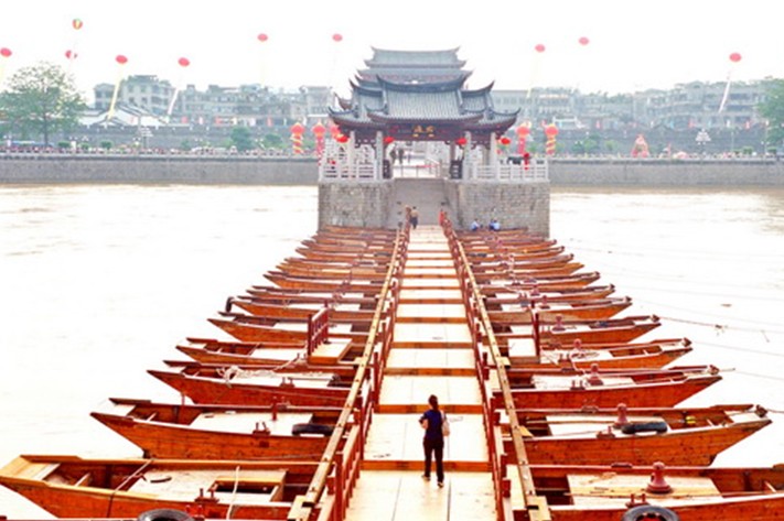 公元1171年 南宋乾道七年,知州曾汪,造舟為梁,舟八十有六只,以接江之東西岸,且峙石于中,以繩其勢(shì),根其址,名曰“康濟(jì)橋”。