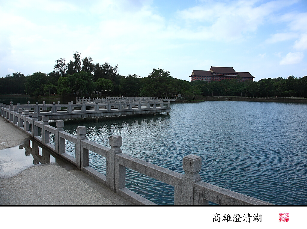澄清湖位于高雄縣鳥松鄉,是高雄第一大湖,舊名“大埤湖”或“大貝湖”,媲美大陸的西湖,也是重要的水源地和風景區。梅隴春曉、曲橋釣月步入巍峨的觀光大門一眼就見到兩座紅色中國式宮殿建筑,左邊的是淡水館,右為海水館。館內陳列世界各國的珍奇魚類。