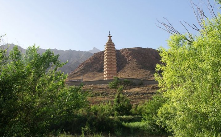 拜寺口雙塔是一對磚砌佛塔山口東側的塔稱為東塔是一座正八角形建筑,高13層,每層塔檐下,各面都有各種獸頭的浮雕,西塔也是13層高,較東塔粗壯外形呈拋物線狀,曾發現梵文、西夏文題記和元代銀幣等。