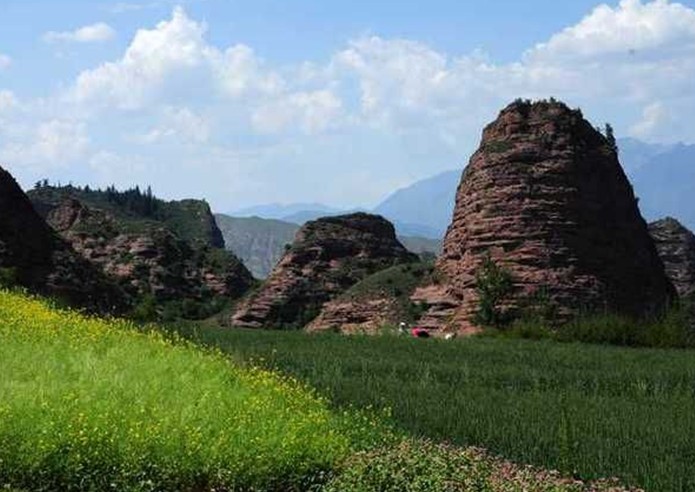 坎布拉國家地質公園,在地質方位上處于青藏高原和黃土高原交會區域。公園內涵蓋“丹霞”峰林地貌景觀、新生界沉積環境和沉積構造類型以及3800萬年以來的地質生態環境演化遺跡。坎布拉丹霞地貌由紅色砂礫巖構成,巖體表面丹紅如霞。奇峰、方山、洞穴、峭壁為主要地貌特征。山體如柱如塔、似壁似堡、似人如獸,形態各異。各種造型栩栩如生,形態千奇百怪,有鬼斧神工之妙。坎布拉地區有十八座奇山險峰,南崇峰、宮保峰、德杰峰、內寶宗峰、大雁峰、尼姑峰、山羊峰、牦牛峰等,這些山峰的命名大都帶有濃厚的宗教色彩。十八座山峰中,阿瓊南宗和內寶宗最為聞名。德杰峰在陽光照耀下,版權所有山東聊城聊之旅國際旅行社有限公司,轉載必究!遠遠望去,猶如拉薩布達拉官之盛景;位于德洪村附近的“仙女聚會”,是由數十個拔地而起,形態各異的圓錐形山體組成,上面有奇花異草點綴,四周地形隆起,猶如“仙女”們在翩翩起舞,景色奇特、秀美,如入仙境,讓人嘆為觀止;強起崗位于風景區的西部,是由大小數十座峭壁如削的塔狀山峰組成,在最佳景點觀賞,似群山起舞,林海茫茫,晴嵐雨雪,氣象萬千,給人以氣勢磅礴,蔚為壯觀之感。阿瓊南宗四周為陡巖峭壁,只有一條石階小徑通往峰頂,這條小徑大部分是在懸崖上人工開鑿而成的。峰頂有一座古剎,數間小石窟,窟內陳列佛像,終年香火不斷。內寶宗是一個四四方方的獨立山峰,上有奇花異草,峰頂有天池、泉水。