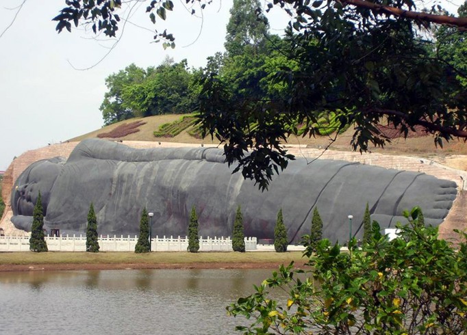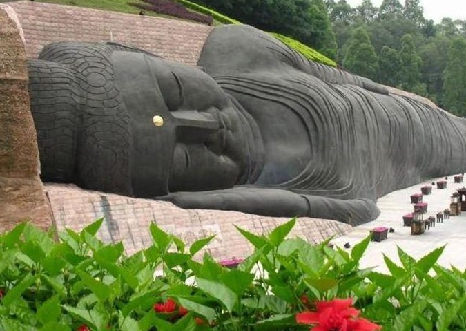 大臥佛位于森林公園天仙巖。相傳當(dāng)年佛教大師六祖惠能傳教后深夜經(jīng)過這里,看到天仙巖靈光閃爍,隱約可見這塊橫臥的大石塊就是一個大臥佛,六祖立即跪拜,求佛祖降福天下。大臥佛的雕造從這個傳說獲取靈感,以盛唐敦煌臥佛為范本,佛身長108米,尺度堪稱世界之最。現(xiàn)經(jīng)改造用紫銅包裝大臥佛,成為金裝大臥佛。大佛前面是錦鯉池和荷花池,與大佛相互映襯引人入勝。大佛對岸一層為長六十米的長廊,廊內(nèi)彩繪佛傳故事,二層為敬佛臺,憑欄對拜,大佛全景一覽無遺。