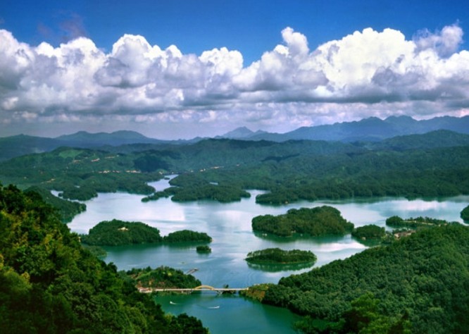 流溪河國家森林公園是經林業部批準建立的首批國家十大森林公園之一,總面積8831公頃,其中流溪湖于一九五八年建成,面積1466公頃,蓄水量3.6億立方米,水深約70米,在碧波萬傾的湖面上,分布著大小二十二個島嶼,如白玉翡翠。在公園的東南部,聳立著五指山、牛角山、雞枕山等海拔千米以上的山峰六座。其中雞枕山海拔1146.7米,是公園內第一高峰。登高望遠,一派“遠山時明滅”、高峽出平湖“的壯觀景象奔來眼底,使人頓覺置身仙幻奇景之中。