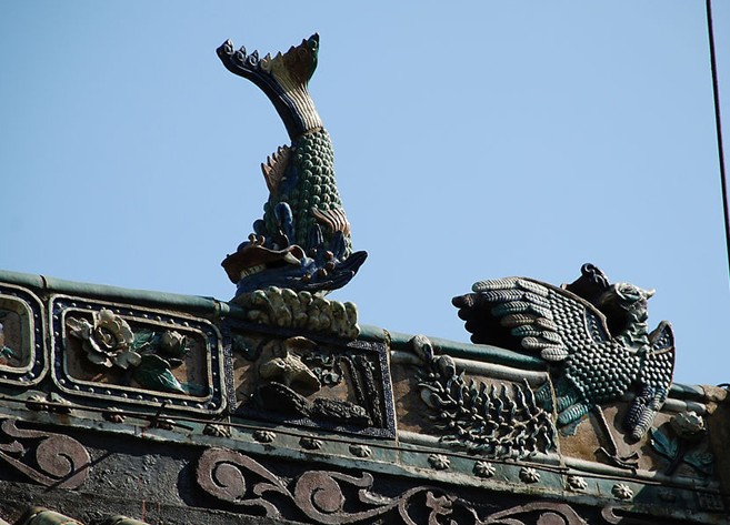 大殿是南海神廟的第四進。它是仿明代木結(jié)構(gòu)琉璃瓦歇山頂建筑。屋頂用綠色的琉璃瓦覆蓋;中間有雙鳳飛翔、鰲魚倒懸等紋飾的琉璃瓦脊;上部有兩條軀體彎曲作騰飛疾走狀的蒼龍造型,它正在爭奪當中的寶珠。據(jù)說,雙鳳代表美麗,整魚代表自由,蒼龍代表權(quán)力,而寶珠代表智慧。