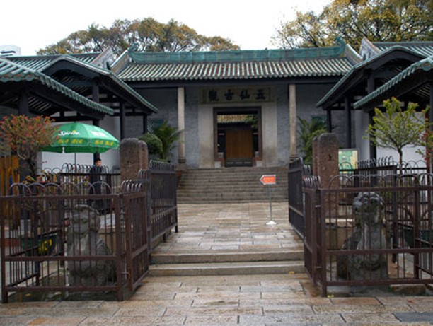 五仙觀位于惠福西路。現寺觀建于明洪武七年(1337年),是一座祭祖五仙的谷神廟。該觀屬道教寺廟,寺坐向南,門上大匾上有清人書寫的“五仙大觀”四個大字。五仙觀依山而建,現存有頭門、后殿、東齋與西齋。五仙觀為綠琉璃瓦重檐歇山頂,木構架保存完好,玲瓏新巧。后殿東側裸露的一塊紅砂巖,上有巨大的腳印凹穴,古人一向認為這是“仙人拇跡”,重點保護下來。明清兩代,這里分別以“穗石洞天”和“五仙霞洞”列入羊城八景。