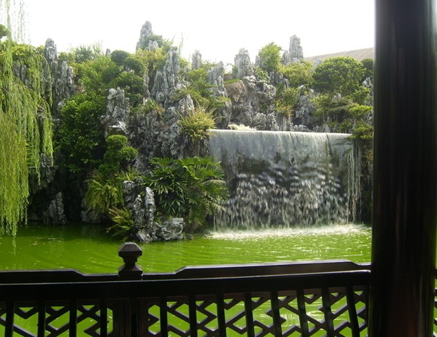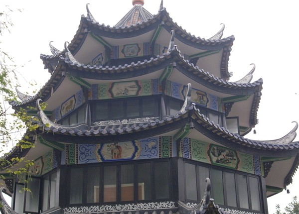 行到回廊深處,便是遠近聞名的“玲瓏水榭”了。它環水而立,是園內第四所建筑俗稱“八角亭”。水榭呈八角形,八面全是窗戶,結構高雅。這樣一來,既能八面通風,又可以八面觀景。對于八角亭的八景,有一首五律詩概括得很好,那詩就是:“丹桂迎旭日,楊柳樓臺青;臘梅花開盛,石林咫尺形;虹橋清輝映,臥瓢聽琴聲;果壇蘭幽徑,孔雀盡開屏。中國園林建筑藝術風格獨特,強調詩情畫意。“玲瓏水榭”之所以遠近傳名,就因為它既有詩情,又有畫意。