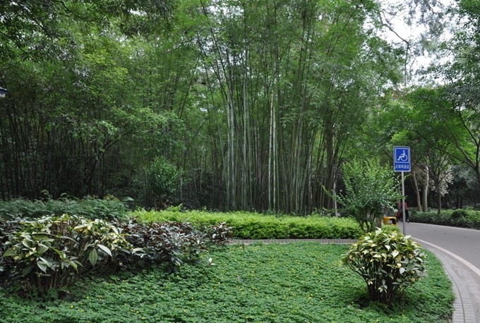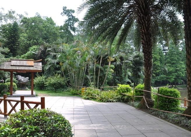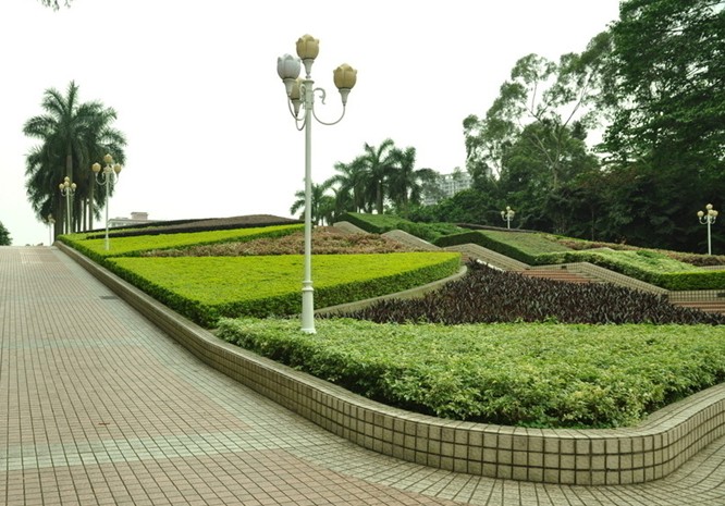 公園環(huán)境舒適,草坪舒展,山丘起伏,林木蒼翠,湖波粼粼,好一派自然清新的郊野風(fēng)情。氣勢(shì)宏偉的南北大門(mén)景色,門(mén)前廣場(chǎng)橫跨寬度達(dá) 100 米,建筑風(fēng)格獨(dú)特,植物色彩配置艷麗,布置緊湊,頗有現(xiàn)代公園氣派。最為壯觀的南門(mén)中軸廣場(chǎng),兩側(cè)種植風(fēng)景林,配置各類棕櫚植物,襯托著中央的立體八角花壇,更加洋溢著嶺南園林的氣息。