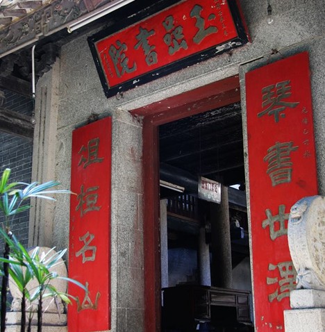 余慶樓平面呈凹字形,當中為觀魚池,三面以廊式樓圍抱,后與玉巖堂相連。余慶樓重檐歇山頂,碌筒瓦面,正面面闊5間16.7、深1間3.8米,5架通檐用2柱,柱外施插栱。門上“玉巖書院”木匣署嘉靖年款。