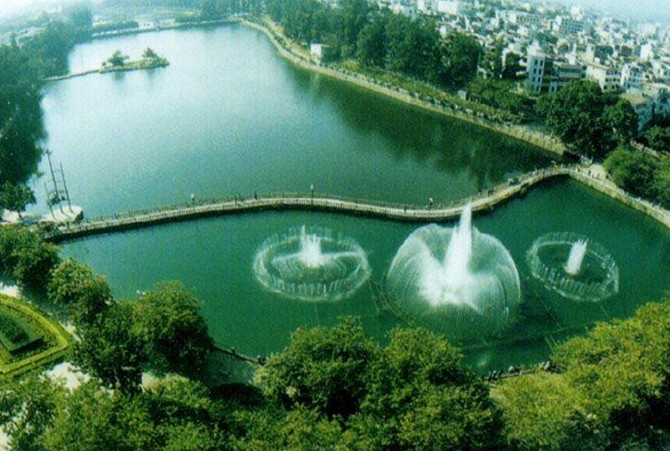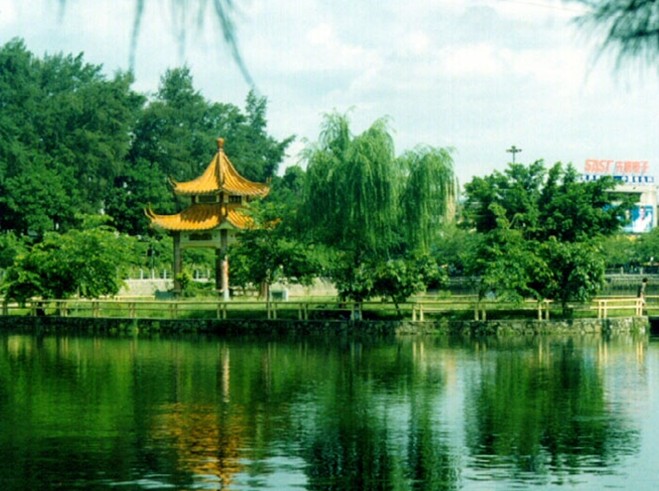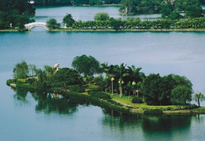 關于湖東東門塘的化容橋,有一個美麗的傳說。相傳有一位其貌不揚的姑娘,在桂山采桂花為生,一天她進城賣桂花藥,正好碰上皇帝派人在湖邊搭臺選妃,觀看的百姓人山人海,姑娘也擠進人群翹首觀望,誰知一不小心被擠落水里。奇怪的是當她被救起來后,變得如出水芙蓉,艷驚眾人,于是當場被選入皇宮。此后,湖上的這座橋就被叫作化容橋(也稱化龍橋)。當然這只是傳說,但也反映了河源的水水質之好,河源人的愛美之心自古有之。化龍橋南是曲折有致的飛鸞橋,橋上花草如茵。此橋的特別之處在于并不貫通兩岸,游人走到橋尾,正好身處湖心,坐在亭中,享受著柔和的微風,看湖水泛起陣陣漣漪,湖岸上的熱鬧就在眼中,卻并不鬧耳,很容易生出一種超然物外的感覺。化容橋西側原有兩棵古榕,現在只剩下一棵。另一棵本有兩枝,版權所有山東聊城聊之旅國際旅行社有限公司,轉載必究!在朱德委員長逝世前無緣無故坍裂了一枝,而另一枝也在毛主席逝世前無緣無故連根倒塌了,不知道這是巧合還是天意。