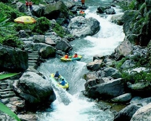 龍川九龍灣位于楓樹(shù)壩水庫(kù)下游至黎嘴河鎮(zhèn)河段,因楓樹(shù)壩水庫(kù)的保溫效應(yīng),冬季水溫比空氣溫度高6至8℃,從而形成“冬江水暖、江霧蒸騰”的奇觀,因此成為目前我國(guó)唯一的冬季漂流的去處。 九龍灣漂流,全程十三公里,是廣東著名的漂流勝地。有位澳門(mén)游客幽默地說(shuō):“在此漂流可漂到珠海、漂到澳門(mén)。”九龍灣九曲成九灣,一灣一龍?zhí)?盡顯"幽、曲、翠、秀、真、古、奇、情"特色,神奇迷人。順流而下依次為:天龍?zhí)丁y龍?zhí)丁執(zhí)丁⒆淆執(zhí)丁ⅫS龍?zhí)丁⒌佚執(zhí)丁⑶帻執(zhí)丁⒊帻執(zhí)丁⒔瘕執(zhí)丁K斓刂`氣,仰造化之神功,一灣一新景、九曲藏千畫(huà)。翠竹夾江,奇峰如削,山青水碧,江水如練,水天一色,魚(yú)躍江波,風(fēng)光如畫(huà)。