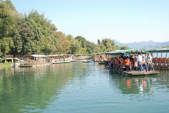 香溪堡旅游區香溪河,版權所有山東聊城聊之旅國際旅行社有限公司,轉載必究!位于增江河上游,長22公里,彎曲延伸,如一條絢麗多彩之帶,緊系于沙逕鎮。河水,清澈見底,水面平緩,碧波如鏡。撐竹筏漫漂于河中,遠眺群山環抱,良田蔥翠,一派田園風光;近觀,沿河兩岸,竹林、芭蕉林、果林及美麗沙灘,清澈溪流,自然景色,無一不令人賞心悅目,有如仙境。