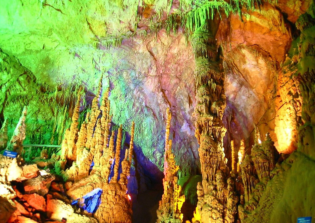織金洞原名打雞洞,位于貴州省織金縣城東北23公里處的官寨鄉,距省城貴陽120公里。1980年4月,織金縣人民政府組織的旅游資源勘察隊發現此洞。它是一個多層次、多類型的溶洞,洞長6.6公里,最寬處175米,相對高差150多米,全洞容積達500萬立方米,空間寬闊,有上、中、下三層,洞內有40多種巖溶堆積物,顯示了溶洞的一些主要形態類別。