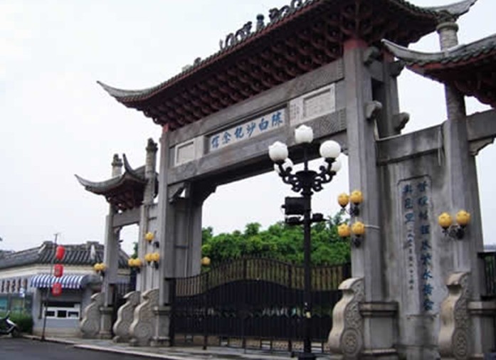 陳白沙祠在江門市郊白沙村,始建于明萬歷十二年(1584年),已成為江門市首屈一指的歷史文化品牌。1985年,江門市政府撥款大修陳白沙祠并辟為陳白沙紀念館,成為知名的旅游景點。祠內正中為陳白沙塑像,旁有用白沙手跡刻的匾聯和碑刻。門前木石結構牌樓,立面三間,四柱三樓。樓上有檐,檐下有玲瓏致密的斗拱、枋椽及精美的瓦面雕飾,是廣東現存的精巧明代牌樓。