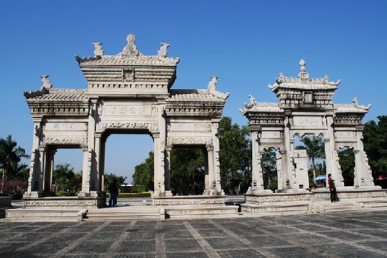 梅溪牌坊在珠海市前山鎮梅溪村。清光緒帝為旌表當地鄉紳、首任清政府駐檀香山總領事陳芳及其父母等人造福桑梓于十二年(1886年)和十七年共賜建牌坊4座,版權所有山東聊城聊之旅國際旅行社有限公司,轉載必究!現存的3座牌坊并排而立。牌坊集西方的裝飾風格和傳統的中國建筑結構為一體,中西合璧,巍峨壯觀,工藝華美,是華南地區罕見的古建筑,也是珠海有名的十景之一。