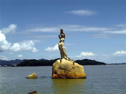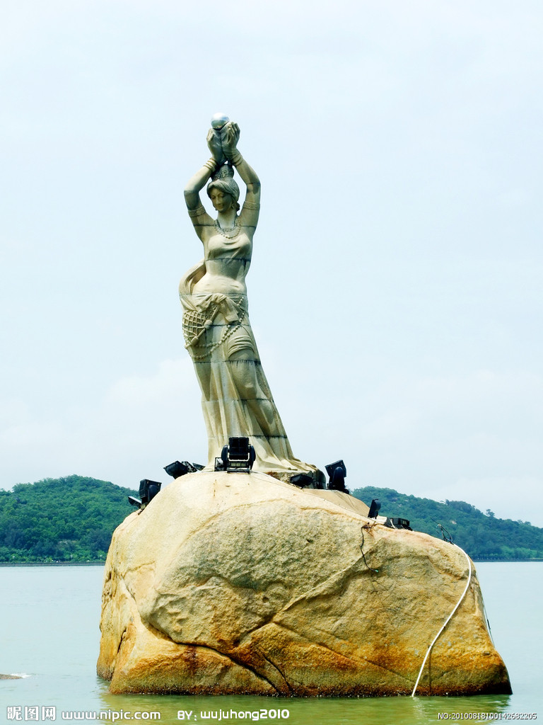 珠海市風景秀麗的香爐灣畔,矗立著一尊巨型石雕——珠海漁女,一條美麗整潔的環海大道——情侶路從她身旁穿過,更使她顯得純潔而大方。她領戴項珠,身掮魚網,褲腳輕挽,帶著喜悅而又含羞的神情雙手高高擎舉著一顆晶瑩璀璨的珍珠,獻給德高望重的九洲長老,并向世界昭示著光明,向人類奉獻珍寶。