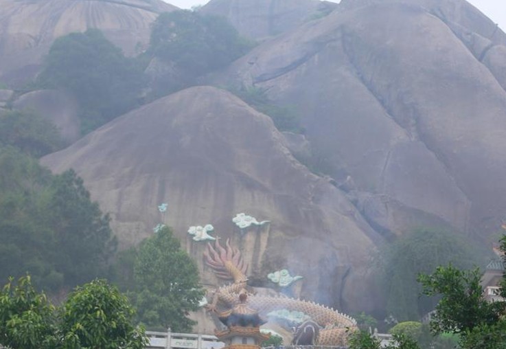甘露寺位于桑浦山玉簡(jiǎn)峰(或獅子巖),此峰巍然矗立,像是一片“朝簡(jiǎn)”穿云破霧直戳藍(lán)天。從山腳登上蜿蜒曲折的三百六十余級(jí)石階,迎面便有一塊刻著“萬(wàn)壽云宮”字樣的大石攔住去路。上山之道,至此兩分。右邊一條,直通山巔;左邊一條,通往佛寺,佛寺的上蓋由一塊凌空飛出的巨石所覆蓋,該石其乎如削,其固如磐,蔚為奇觀,上書“玉簡(jiǎn)書院,甘露洞天”八個(gè)大字。再走進(jìn)前,又有兩行小字映入眼簾:“甘露禪寺飄渺云中,天然石室鬼斧神工。”此聯(lián)是清代同治年間儒士林大銓所題。