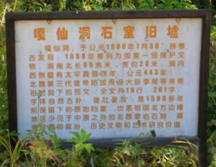 1980年7月,考古工作者在洞內發現了北魏太武帝拓跋燾于公元443年(太平真君四年)派遣中書侍郎李敞祭祖時所刻的祝文。祝文刻在距洞口很近的西側石壁上,共19行201字。字體古拙,介于隸楷之間。這一重大發現,證明了嘎仙洞就是《魏書》中提到的拓跋鮮卑的祖廟石室。