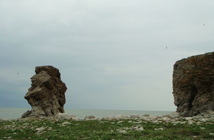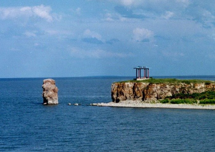 成吉思汗拴馬樁 - 風景成吉思汗拴馬樁位于呼倫湖西岸, 距新巴爾虎右旗所在地阿拉坦額莫勒鎮38公里,離滿洲里市88公里,是一處三面環水的峭壁。南臨一湖碧水,放眼望去,石壁嶙峋峭拔,光滑如刀削;北、東面呈陡坡,下臨湖灣,只有西部為緩坡與湖岸相連,山頂上有一座高大的涼亭。