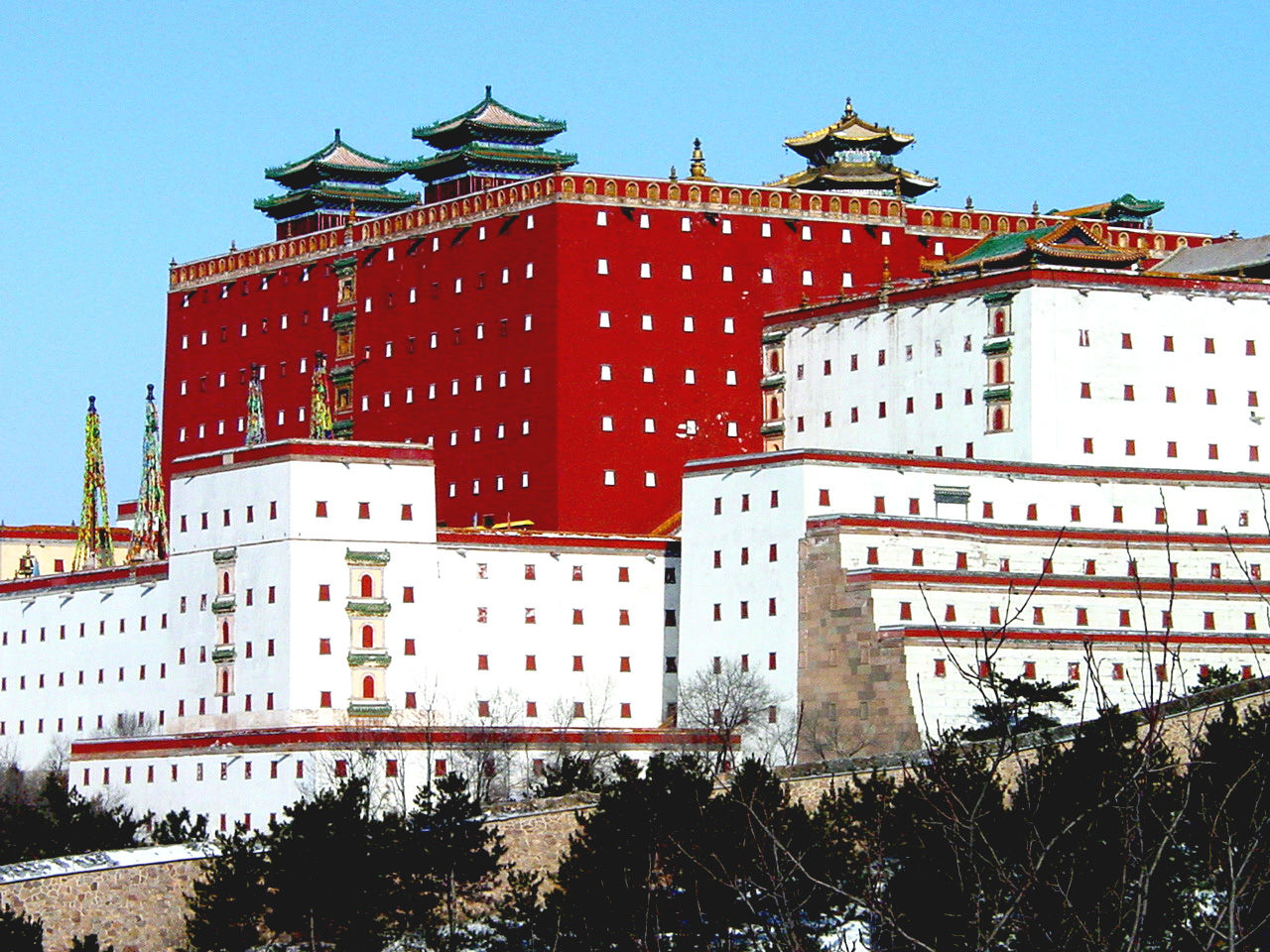 大紅臺南、第一部分兩側散置30余座大小白臺,成“×”形不規則布置。白臺分殿臺、樓臺、敞臺、實臺,形狀不一,體量不等,功能各異。層高一至四層,二、三層者居多,大都白灰抹面,青磚鑲邊紅色盲窗,琉璃砌頂,版權所有聊城聊之旅國際旅行社有限公司,轉載必究!上檐挑出淌水長瓦。白臺為藏式平頂碉房形制,建筑用漢族磚混結構法式。有的兩座白臺組合成一處院落作僧房;有的臺上建漢式殿堂,作佛堂、鐘樓使用;有的臺頂置舍利塔;有的白臺砌成實心,只起障景增景及點綴作用。白臺群總體效果表現了西藏布達拉宮前山腳下梵字的特征。南部宮墻兩頭分置角樓,實墻白臺砌盲窗,頂部起雉堞。宮墻兩側白臺中間辟門,上起廡殿,對稱配置,供僧人進出使用轉經桶。
