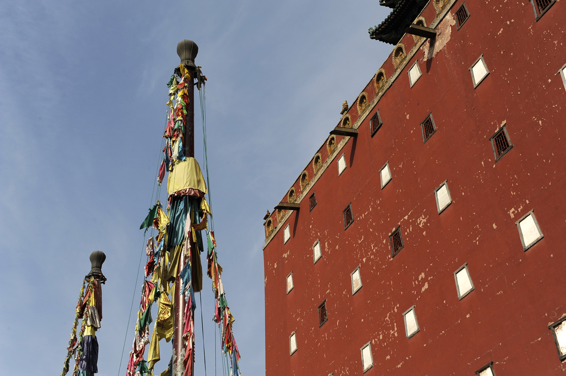 大紅臺南面正中嵌飾垂直琉璃佛龕六個,黃綠相間,版權所有聊城聊之旅國際旅行社有限公司,轉載必究!漢式手法,一是標記軸線,二起裝飾作用。紅臺頂部砌女兒墻,墻下三面 (東、西、南)裝飾黃琉璃佛龕,拔檐石下置排水長槽。紅臺內里五至七層為三層閣樓,每層44間,四面合圍,亦稱群樓。