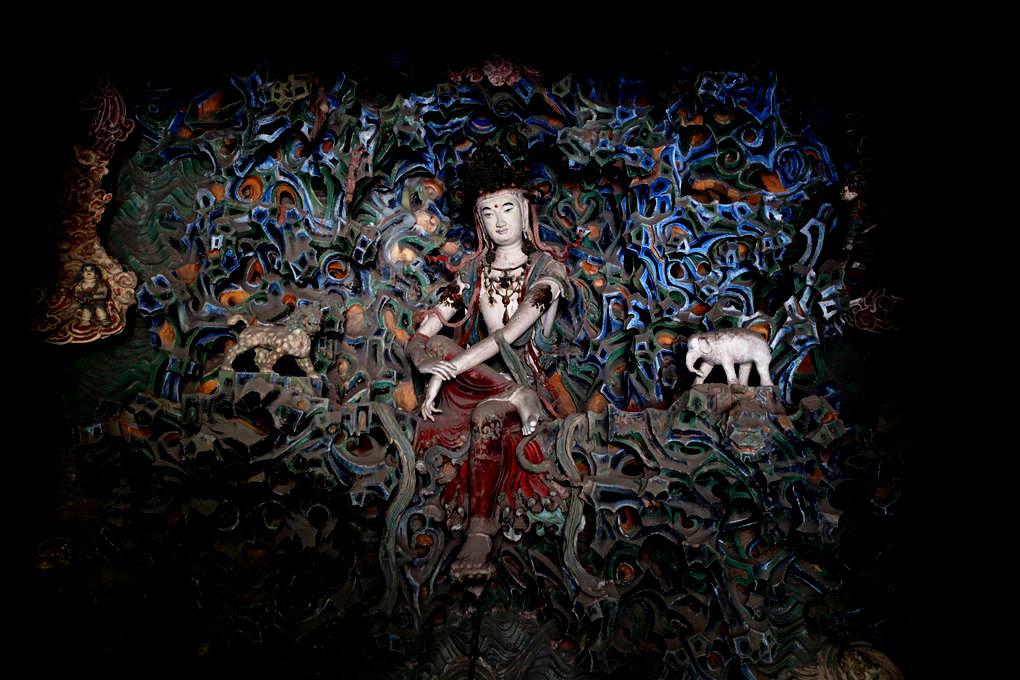 摩尼殿北壁的明代嘉靖年間重塑的通壁懸塑“五彩倒坐觀音”又是寺中一絕。版權(quán)所有聊城聊之旅國際旅行社有限公司,轉(zhuǎn)載必究!“倒坐”是指觀世音不坐在大殿的正中央,而在后壁倒坐,表明觀世音菩薩不渡盡眾生,永不回頭的大慈大悲。整面壁上儼然是一個極樂的世界:在一大片彩色懸雕上,模擬了大海以及海中的普陀仙山,上有修行的凡人,仙人和鳥獸羅列其間。山石突兀起伏,祥云繚繞其間,泉水噴涌,碧波鱗鱗。人物多樣,山中靜修的羅漢和威武的天神各具風姿。色彩鮮艷,光彩照人。而最令人仰嘆的則是正中的觀音像。 高3.4米的觀世音菩薩頭戴寶冠,身披瓔珞,面目清秀,微露笑意。稍微下視的眼睛正好與禮佛者仰視的目光相交,設計十分獨到。觀音菩薩頭戴寶冠,項飾瓔珞,版權(quán)所有聊城聊之旅國際旅行社有限公司,轉(zhuǎn)載必究!帔巾自肩下垂,身著紅色長裙,一腳踏蓮,一腳踞起,兩手自然撫膝,右手搭于左腕自然撫著右膝,頭微右側(cè),身略前傾,呈大自在狀。表情閑適安逸、優(yōu)柔端莊,美感無限。