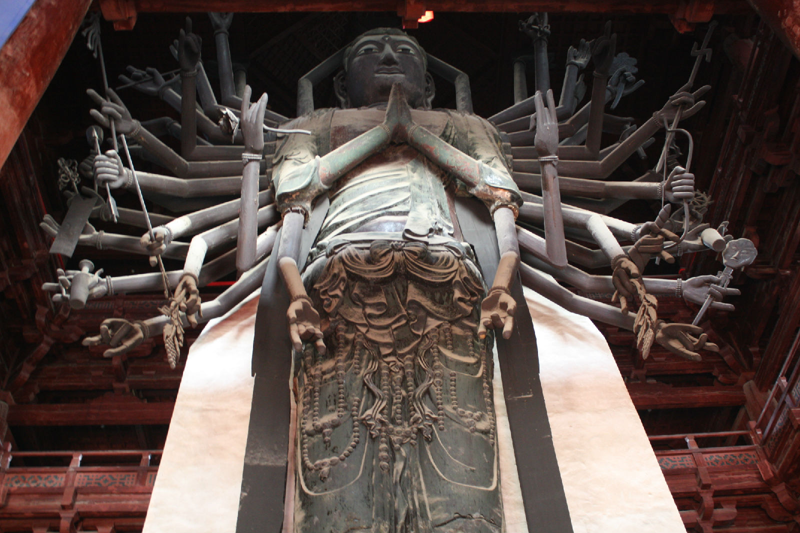 大悲閣是隆興寺的主體建筑,坐落在中軸線後部。閣前古柏參天,閣後老槐吐翠,周圉蒼松、百花環(huán)繞,景色清幽宜人。閣高33米,面闊七間,進深五間,為五重檐三層樓閣。舊名“佛香閣”、”天寧觀音閣”。據(jù)記載,該閣始建于968-976年(宋初開寶年間)。大悲閣內(nèi)矗立著一尊高大的銅鑄大菩薩,稱“大悲菩薩”,高19.2米,立于2.2米高的須彌石臺上,是中國保存最高的銅鑄觀音菩薩像。像奉宋太祖趙匡胤敕令而造,周身有42臂,又稱“千手千眼觀音”。各臂分持日月、凈瓶、寶塔、金剛、版權(quán)所有聊城聊之旅國際旅行社有限公司,轉(zhuǎn)載必究!寶劍等,可惜兩側(cè)4o雙銅手臂均被毀,已改為木制,僅前胸兩臂為原鑄。觀音像神態(tài)自若,比例均勻,衣紋流暢,線條細膩,頗具宋代藝術(shù)風格。據(jù)寺內(nèi)一通宋碑記載,其鑄造程序是:先鑄好基礎(chǔ),然后分七節(jié)鑄造大菩薩。第一節(jié)鑄下部蓮花座,第二節(jié)鑄至膝蓋,第三節(jié)鑄至臍下,第四節(jié)鑄至胸部,第五節(jié)鑄至腋下,第六節(jié)鑄至肩膊,第七節(jié)鑄至頭部。最后添鑄四十二臂。菩薩的手均為木雕而成,其上裹布,一重漆,一重布,然后用金箔貼成。