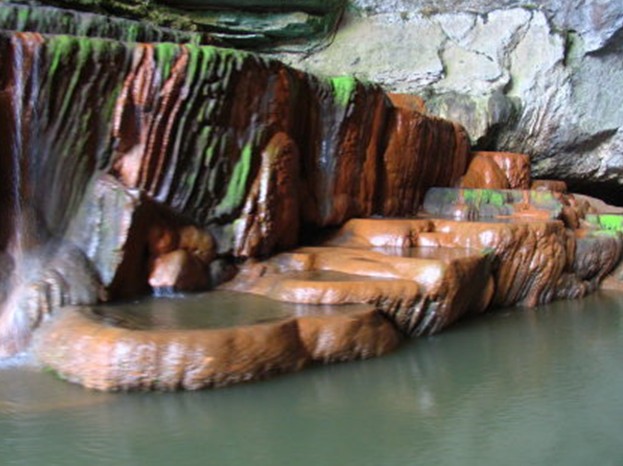 陽春玉溪三洞全長3公里,均可坐船瀏覽。第二洞長330米,水深2-5米,水面寬20-30米,河水清澈如玉,水中多生長鯉魚。洞中景物豐富,尤以“三變石”為趣,詩人張永枚曰:“遠似漁翁釣清流, 近如獅子滾繡球,忽變犀牛望明月,一石三景迷輕舟”。第一洞頂?shù)?ldquo;皇冠”石,酷似皇冠,游人在船上隨即可拍攝一幅頭戴皇冠的照片。第一洞長400米,上面有一層旱洞,水面距洞頂高48米,該洞以“金盞疊泉”最為壯觀,一個個金黃色的石盞滿載清澈的泉水往下流。詩人韋丘贊道:“串玉溪穿三洞天,柔情碧水石能言,聲聲燕語留歸客,舉漿猶疑落漿難”。