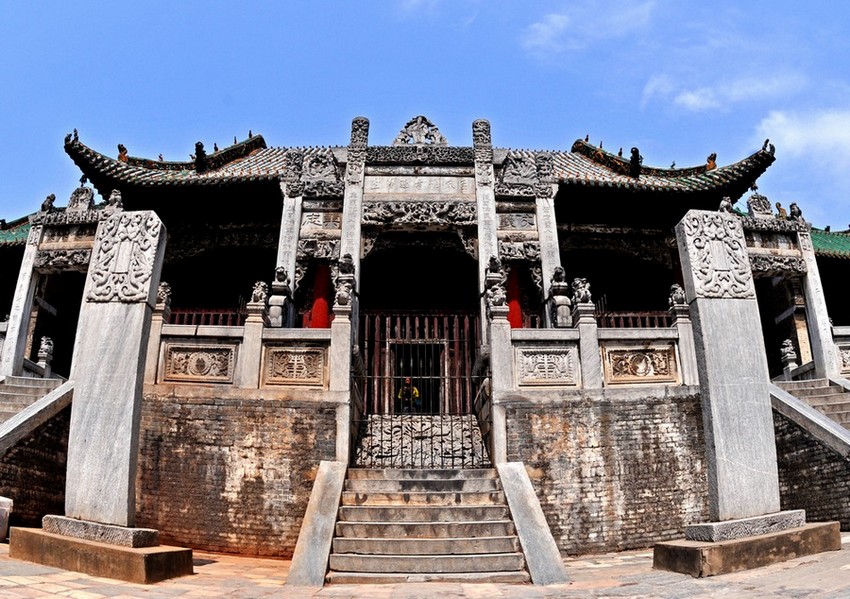 建筑群分前、中、后三進院落。位于中軸線上的建筑有:琉璃照壁、懸鑒樓、石牌坊、大拜殿、春秋樓。兩側(cè)相陪建筑有木旗桿、鐵旗桿、東西轅門、東西馬廄、鐘、鼓樓、東、西長廊、腰樓、藥王殿、馬王殿、道坊院等。其中春秋樓及其附屬建筑于咸豐七年為捻軍所焚,現(xiàn)存建筑152間。