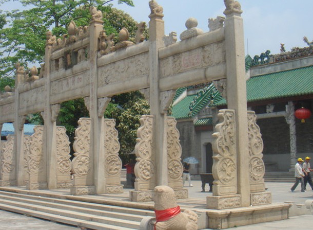 白沙龍母廟現存較好的是"廣蔭坊",它是一個不可多得的清代古觀石牌坊。廣蔭坊立在500毫米高的精雕花崗巖石須彌座上,面寬17M,高6.5M(廟面寬33.33M),約為廟寬1/2,六柱開間,全為花崗巖石精雕而成的沖天柱石牌坊。上鑲一塊前后兩面刻著剛勁有力的宋體"圣旨"的匾額,下額枋板的匾額中刻有穩健,莊重的"加封廣蔭"與背面歷代帝皇的八大封號,兩則邊上配以人物花卉。版權所有山東聊城聊之旅國際旅行社有限公司,轉載必究!左右額枋板上前后以一種風韻雅趣的構圖刻出玉龍戲水與雄獅下山的精雕石刻。稍間的額枋板上的匾額也刻有"永濟","孝道"的雄健大字,邊上各有花卉相配,柱上刻有穩健的楷書楹聯及記事。