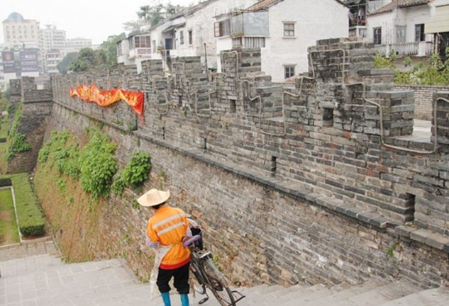 廣東僅存的完整古城墻,位于肇慶市區(qū)內(nèi)人民南路一帶,始建于宋代,呈長(zhǎng)方形,周長(zhǎng)280 .2米,制高點(diǎn)在城北披云樓。目前城墻高出地面10米,城墻兩側(cè)由磚砌成,中間夯土,外圍共有28個(gè)城垛,城磚規(guī)格達(dá)40多個(gè)品種,是歷史上曾多次修葺的見(jiàn)證。當(dāng)年廣西壯族首領(lǐng)儂智高反宋,端州太守丁寶臣因無(wú)城墻防守,棄城而逃。儂智高失敗后,官府于公元1053年始筑土城墻,至明末共修城墻十一次。