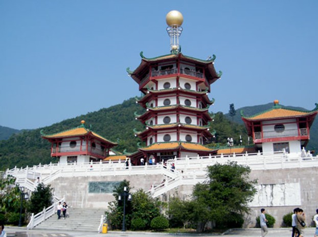 云修臺以北,即為關公財神廟。欲臨廟內,須登三層大臺階,拾級而上。每層臺階上都有一個四米進深的小平臺,平臺墻壁上有精美的漢白玉浮雕,雕刻精美,每個浮雕都含一個題材,內容廣泛。平臺欄桿皆為漢白玉,古樸典雅。最后兩組臺階之中,仿制故宮太和殿前臺階,各置兩塊雕龍石刻,騰云駕霧,張牙舞爪,氣度非凡。登上臺階,眼前展現出一座巍峨聳立的八角塔樓,名為“觀星樓”。塔高六層,白墻丹柱黃瓦,翼角圓窗,層層飛檐,八望如一,雍容大方,高古雄渾。塔頂立有二龍戲珠之寶珠。門前紅柱上有一聯:“樓觀端州白云入,門對西江日月生。”端州白云,西江日月全囊其中,是畫龍點睛之妙對。走進樓內,首層供奉著彌勒佛像,咧嘴大笑、袒胸露腹、盤腿而坐、手托元寶。旁懸一副對聯警世:“以忠厚相承積金皆由積德,為秀靈所聚多寶更要多賢。”四周壁架上陳列著端硯、奇石、觀音立像、臥佛等眾多藝術品,琳瑯滿目。自二樓到六樓,依次供奉著黑、白、黃、紅、綠五姓財神。這五位財神,是由印度財神演化而來。登上觀星樓頂層,步出閣外,憑欄遠望,其開闊之勢更甚于云修臺,仰觀蒼穹,白云日月似可手摘;俯瞰眼前,云修秀臺儼然腳下;平視遠方,肇慶全景盡收眼底。版權所有山東聊城聊之旅國際旅行社有限公司,轉載必究!星湖如鑒,七巖若棋,西江似帶。下樓出閣,見一大院,院北中軸線上坐落著賜財寶殿,院東乃好運閣,院西為忠義軒。院中有池,壽龜、錦鯉、仙鶴全納其中。賜財寶殿白墻黃瓦,與觀星樓色調統一,重檐歇山頂。大門有一聯:“莫笑我竹骨泥身許個愿試試,別管你玉衾錦衣燒柱香瞧瞧。”殿內主供正財神趙公明,神情肅穆、氣度威儀,輔奉福、壽、祿、喜神和利市天官等16尊神像,形態各異,栩栩如生。出寶殿,向東進好運閣,祀奉文財神范蠡,閣內長聯精煉概括了范蠡生平:“應怨大樹招風,高功見疑,陶朱事業原無奈;贏得紅顏知己,青史傳美,煙水生涯聊可娛。”向西望忠義軒,見門聯:“儒稱圣釋稱佛道稱天尊,漢封侯明封王清封大帝。”儒釋道三教皆祀關公。漢封“漢壽亭侯”,宋封“昭烈武安王”,明封“協天大帝”,清封“忠義神武靈佑仁勇威顯護國保民精誠綏靖翊贊宣德關圣帝君”。入殿視關公像,鳳眼雙睜,蠶眉上挑,絕倫逸群。神像旁又有一聯:“數定三分扶炎漢,伐魏討吳,辛苦備嘗,未了平生事業;志在一統佐熙朝,伏魔蕩寇,神威遠震,只完當日精忠。”是關公一生經歷的概述。