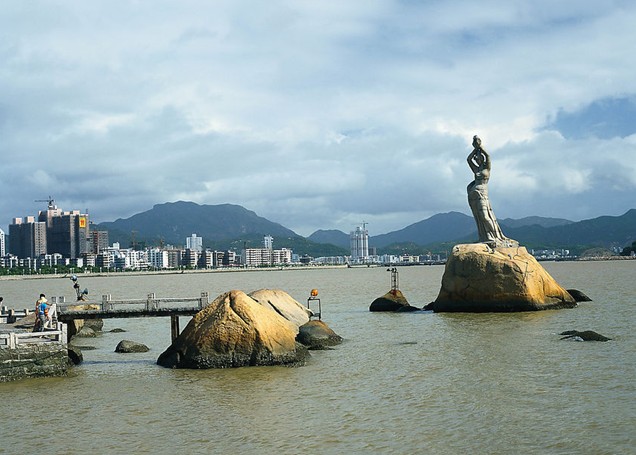 珠海市風(fēng)景秀麗的香爐灣畔,矗立著一尊巨型石雕——珠海漁女,一條美麗整潔的環(huán)海大道——情侶路從她身旁穿過,更使她顯得純潔而大方。她領(lǐng)戴項珠,身掮魚網(wǎng),褲腳輕挽,帶著喜悅而又含羞的神情雙手高高擎舉著一顆晶瑩璀璨的珍珠,獻給德高望重的九洲長老,并向世界昭示著光明,向人類奉獻珍寶。