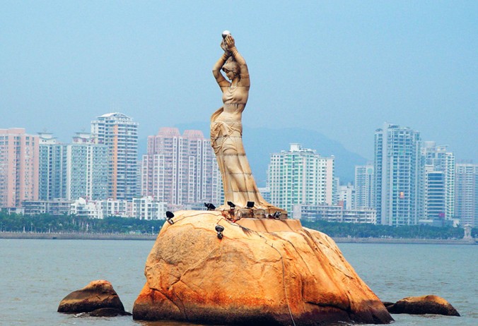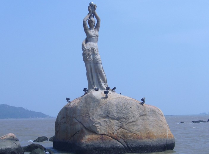 珠海漁女是珠海市的象征,位于珠海風(fēng)景秀麗的香爐灣畔,矗立著一尊巨型石刻雕像——珠海漁女,她領(lǐng)戴項珠,身掮漁網(wǎng),褲腳輕挽,雙手高高擎舉一顆晶瑩璀璨的珍珠,帶著喜悅而又含羞的神情,向世界昭示著光明,向人類奉獻珍寶。