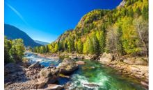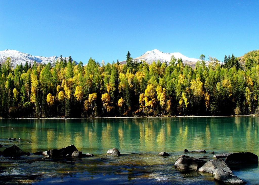 一進入9月,喀納斯便進入了純金的時節。天高云淡,藍天如洗,層林盡染,滿目流金,深綠的山坡上透出一片片黃枝紅葉相間、青山白雪相連的色塊,湖畔的白樺、紅松、冷杉等樹木會以金黃、橙紅、黛綠等交叉的色彩,烘托著山頂耀眼的雪色,投映在翡翠石般的喀納斯湖上,光彩奪目,令人沉醉。此時也是攝影的最佳時節。