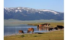 鴨澤湖位于喀納斯村南邊,它是由喀納斯河改道后廢棄河段——牛軛湖洼地組成,呈長形蝶狀,沿洼地南端形成一個南北走向的寬淺湖泊,形似蝶狀的一弘碧水與沼澤濕地連為一體,長3km,寬600~800m,面積約1.3 平方公里,湖周開闊平緩,湖泊似鏡。湖水與周圍開闊的沼澤濕地和河谷草原上,棲息著種類繁多的禽鳥,成群的野鴨、大雁和天鵝等也時常光顧此地,它們在寧靜的水面上安閑的游戈。據說,當野鴨群被驚動時,便會看到它們一只只、一批批漸次飛起,翅膀拍打著水面,十分壯觀。也許是季節的關系,我們沒能看到成群的野鴨,但卻看到碧綠的草地環繞明鏡般的湖水,寧靜秀美,廣袤的沼澤草原上,牛羊在游閑覓食,白色的蒙古包星星點點,帳篷前的地灶上,炊煙裊裊,與青山和白云構成一幅天然的巨型山水畫,令人賞心悅目。