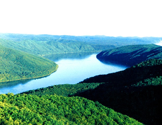 龍江三峽位于黑龍江蘿北段,三個美麗的峽谷分別是龍門峽、金龍峽和金滿峽,全長共62公里。乘著小艇逆江而上,江風夾著濕氣撲面而來,直鉆進人的毛孔里去。放眼望去,只見江水蜿蜒,江流湍急;兩岸山崖峻美,峰巒疊嶂。山環水抱,交相輝映,既有漓江的秀色,也有岷江的磅礴;既有長江三峽的雄奇,又有桂林山水的清雋;山青如繡,水綠如絹,江山如畫,濃彩重墨中透著淡雅,清新豪放中顯得莊重。“早觀山,青灰欲染山凝黛;晚看嶺,云霞蒸蔚嶺含輝”。夕陽西下,天這邊還是云霞燦爛,天那邊已是良月相伴。