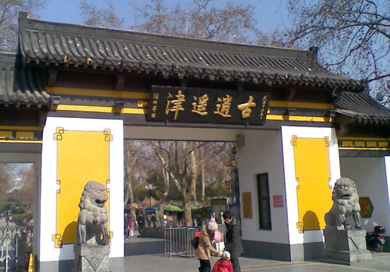 公園南大門是一座高近10米、三開間、牌樓式的仿古大門。大門上方一塊古色古香的牌匾上書“古逍遙津”四個鎏金大字,字為清狀元、宣統皇帝溥儀的老師陸潤庠手書。進入公園,首先看到的是一尊持槍躍馬的張遼青銅塑像。塑像高達5米,底座上有“威震逍遙津”五個大字。