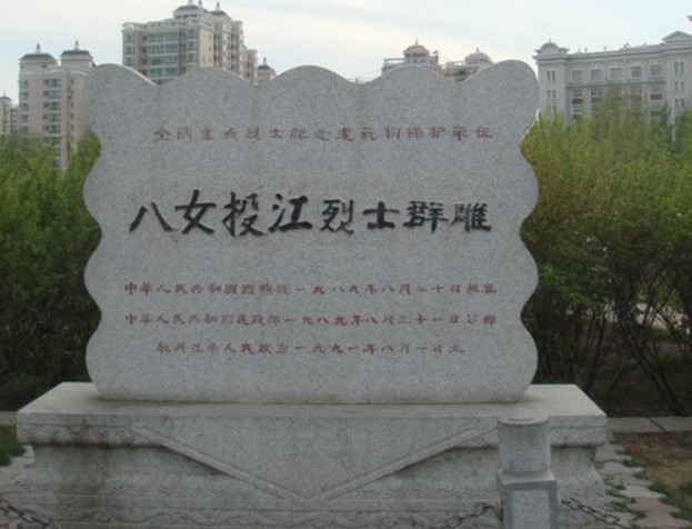 八女投江紀(jì)念地位于牡丹江畔的江濱公園。該群雕1988年落成,高13米,長(zhǎng)8.8米采用花崗巖石材雕鑿而成,"八女投江"四個(gè)大字由全國(guó)政協(xié)主席鄧穎超生前書寫。站在這碩大的群雕前,無不使人思維翻滾,心潮澎湃,當(dāng)年八女視死如歸,英勇戰(zhàn)斗的情景又呈現(xiàn)在人們的面前,1938年10月下旬,東北抗聯(lián)四、五軍西征婦女團(tuán),在指導(dǎo)員冷云帶領(lǐng)下,擔(dān)負(fù)著掩護(hù)大部隊(duì)轉(zhuǎn)移的任務(wù),她們英勇抗擊日軍熊谷部隊(duì)的襲擊,在彈盡糧絕的情況下,寧死不屈,最后毅然背著負(fù)傷的戰(zhàn)友,投入林口縣境內(nèi)的兇猛暴烈冰冷刺骨的烏斯渾河,為國(guó)捐軀,譜寫了一篇驚天地,泣鬼神的抗日史詩。電影《中華兒女》、《八女投江》都是根據(jù)她們的事跡拍攝的。1982年10月在林口烏斯渾河畔 建起了"八女投江紀(jì)念碑",上題"八女英烈光照千秋"八個(gè)大字,它背負(fù)蒼山,河水縈繞,其志銘記述了冷云、楊貴珍、安順福、胡秀芝、郭桂琴、黃桂清、王惠民和李風(fēng)善八位巾幗的英雄業(yè)績(jī)。1984年被國(guó)家列為二級(jí)文物保護(hù)單位。牡丹江市江濱公園的八女投江群雕也被批準(zhǔn)為省級(jí)愛國(guó)主義教育基地。1984年籌建,時(shí)任全國(guó)政協(xié)主席鄧穎超為群雕題寫了“八女投江”四個(gè)大字。1986年9月7日舉行工程奠基儀式,1988年8月1日落成。時(shí)任全國(guó)政協(xié)副主席、全國(guó)婦聯(lián)主席的康克清參加了奠基及落成典禮。群雕工程總造價(jià)424萬元。其中:民政部撥款73萬元,財(cái)政部撥款50萬元,國(guó)家城雕組出資16萬元,市財(cái)政撥款35萬元,全市人民捐款250萬元。石雕群像由中央美術(shù)學(xué)院雕塑系設(shè)計(jì),四川美術(shù)學(xué)院雕刻,版權(quán)所有山東聊城聊之旅國(guó)際旅行社有限公司,轉(zhuǎn)載必究!四川美院雕塑廠、牡市第三建筑工程公司等20個(gè)單位負(fù)責(zé)底座、雕像、紀(jì)念館和廣場(chǎng)的施工任務(wù)。群雕坐南朝北,占地面積8 000平方米,高8.8米,長(zhǎng)18米,寬6.9米,由花崗巖石雕塑而成。群雕南側(cè)建有牡丹江烈士紀(jì)念館,陳列面積160平方米,采用單層半地下式建筑。北墻兩側(cè)設(shè)門,正中在漢白玉石上鐫刻著中共牡丹江市委員會(huì)、市人民政府題撰的“八英烈女銘志”。展廳陳列有康克清1986年題詞“八女英靈永存史冊(cè)”,王震1990年8月4日題詞“向抗日烈士致敬”,還有周保中、李延祿等人題詩。展廳里展出了八位女烈士的生平簡(jiǎn)介、圖片和部份烈士遺物,為全國(guó)重點(diǎn)烈士紀(jì)念建筑物保護(hù)單位和省級(jí)愛國(guó)主義教育基地。