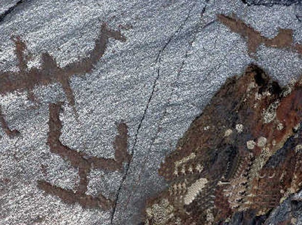 畫馬崖巖畫群中的巖畫,是用極其簡單的線條勾勒出的各種造型,類似于現代繪畫中的速寫風格,但是其線條卻異常簡潔甚至抽象,寥寥數筆卻惟妙惟肖。以現代人的認知對這些圖案進行解讀,簡單線條勾畫出的圖案可能是馬、人和太陽,還有一些魚、虎、龍、狗、仙鶴等等。然而,專家考察卻發現,巖畫中描述人的線條頭型呈不規則的圓隆狀,四肢和身體都用形狀不同的線條表示。
