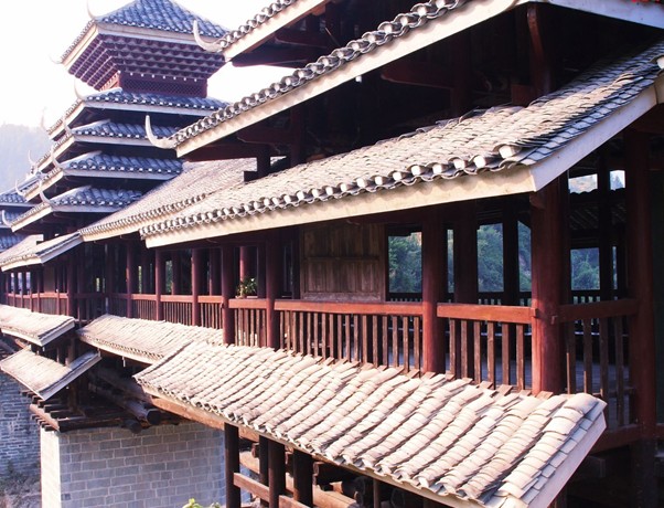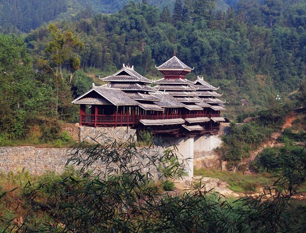 地坪風(fēng)雨樓 這是貴州省最大、造型最美的風(fēng)雨橋。長達(dá)50多米的地坪風(fēng)雨橋始建于清光緒二十年即公元1894年,1959年毀于火災(zāi),1964年重建。整座橋不用一釘一鉚,而運用杠桿力學(xué)原理,將大小不一的柱、枋、檁、凳、欄桿等全部用杉木鑿榫穿枋構(gòu)成。橋體為長廊式木結(jié)構(gòu),橋上有一大兩小共三座橋樓。居中的大橋樓是鼓樓式建筑,兩邊的橋樓皆為三層重檐雙斜面屋頂。
