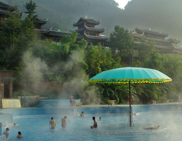 劍河溫泉為國內(nèi)稀有的氡硫溫泉,日涌水量1800 噸,富含氡、硫、鐵、鉀、鈣等元素,其理化指標與法國著名的維稀溫泉相似,有消毒、去疾、健膚之功效,常浴可治療和預防多種疑難病癥,自古享有 “苗鄉(xiāng)圣水” 、“西部浴都”之美譽。1989年,在這里開發(fā)為現(xiàn)代化的溫泉浴場,里面有一幢內(nèi)設(shè)鴛鴦浴池、桑拿浴池、美容廳的“舒樂”健身房,還有4個露天浴池,其中有為當?shù)孛缱逋碛玫穆短煸〕兀线叺氖悄谐兀逻叺臑榕兀ㄋ┧齻冎两襁€保持著原始古樸的裸浴習慣。裸浴,在(他)她們看來,是一種自然現(xiàn)象,無須顧忌,對偶然出現(xiàn)在浴池邊的外地人,版權(quán)所有山東聊城聊之旅國際旅行社有限公司,轉(zhuǎn)載必究!只要你不是在有意偷看,(他)她們會毫不在意。