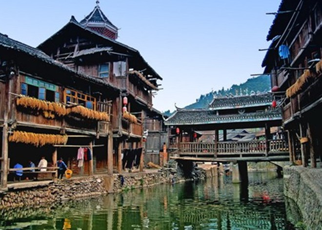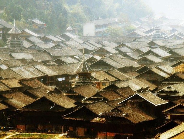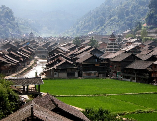 肇興,舊稱[肇洞],位于黎平縣城南70公里,是全國(guó)最大的侗寨,有世界最大的侗寨鼓樓群。全寨居住3415人,聚居侗族3125人,全為陸性侗族,分為仁、義、禮、智、信五大房族,各自建有鼓樓、花橋,大小不一,高低不等,風(fēng)格各異,別具匠心。寨子里桿欄式吊腳樓房,鱗次櫛比,疏密有致,全用杉木建造。有眾多的花橋、戲樓、歌坪、禾晾、谷倉(cāng)、瓢井、侗民居中等建筑,布局緊湊,結(jié)構(gòu)合理。