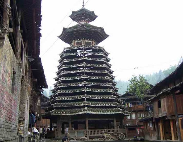 始建于清代康熙十一年(1672)秋。版權(quán)所有山東聊城聊之旅國(guó)際旅行社有限公司,轉(zhuǎn)載必究!該樓為木質(zhì)結(jié)構(gòu),形如寶塔,雙葫蘆頂。高25米,占地面積160平方米。內(nèi)有4根大柱,每根直徑0•8米,高15米,每柱之間距離3.6米,構(gòu)成椎形方架,是鼓樓的骨干部分。距4大柱外圍3米處,豎有8根高3.5米的支柱,將大柱團(tuán)團(tuán)圍住,并以穿枋與內(nèi)柱相連,呈輻射狀。一層樓上疊有數(shù)層,每層有8根短爪柱層層疊豎,直至第十一層。鼓樓頂部,還有兩層八檐八角的傘頂寶塔,名曰“干梗”,其工藝精細(xì),為中國(guó)木質(zhì)結(jié)構(gòu)建筑中所罕見(jiàn)。在此層頂閣中,有一個(gè)長(zhǎng)約3米,直徑約10公分的木鼓。最頂部嵌有陶瓷寶珠尖頂,直插云霄。頂閣下面各層梁上釘有橡皮,并用大小羊桃藤捶爛與石灰拌合架瓦,十分牢固。檐閣下畫有龍、鳳、魚(yú)、蟹、蝦等動(dòng)物圖案,美麗壯觀。此樓的最低層嵌有3扇大門,正中設(shè)有一個(gè)火坑,周圍鋪青石片。該鼓樓為國(guó)家級(jí)重點(diǎn)文物保護(hù)單位。中國(guó)清代侗族建筑。在貴州省從江縣西北約50公里的增沖寨。據(jù)碑文記載,始建于清康熙十一年(1673),道光、光緒時(shí)曾維修。鼓樓系侗族特有的民俗建筑,是侗家聚眾議事、排解糾紛、迎送賓客、對(duì)唱大歌和吹笙踩堂等重大活動(dòng)的場(chǎng)所。一般一姓建鼓樓一座,因此又是族姓的形象標(biāo)志。增沖鼓樓既保存了中國(guó)古代建筑的特色,又具有濃厚的民族風(fēng)格,規(guī)模宏大,造型美觀,工藝精湛,具有較高的價(jià)值。1988年中華人民共和國(guó)國(guó)務(wù)院公布為全國(guó)重點(diǎn)文物保護(hù)單位。1997年6月,國(guó)家郵電部曾發(fā)行《侗族建筑》一套四枚郵票,其中有一枚就是增沖鼓樓。由此可見(jiàn)增沖鼓樓在由數(shù)不清的鼓樓、花橋、戲臺(tái)和吊腳樓構(gòu)筑的五彩繽紛的侗鄉(xiāng)建筑中所占的地位。