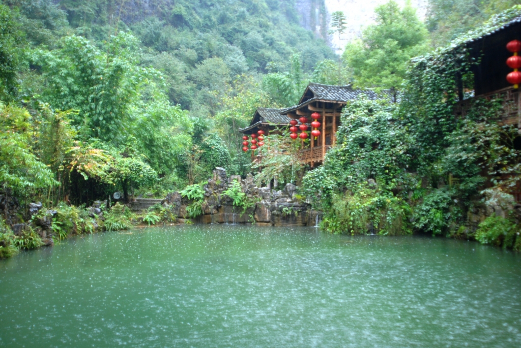 桃花源景區(qū)入口處是一片茂盛蔥郁的桃樹林,一條清凈小溪潺潺流過,若是待到陽(yáng)春四月,便正應(yīng)了詩(shī)中那句"忽逢桃花林,桃花源夾,岸數(shù)百步,中無雜樹,芳草鮮美,落英繽紛",行人慢慢走入洞穴,靜聽?zhēng)r壁滴水落珠之聲,忽覺一股脫俗之意,再前行便是豁然開朗的田園景色:"土地平曠,屋舍儼然,有良田美池桑竹之屬。"在一瞬間,便恍若隔世,返璞歸真。